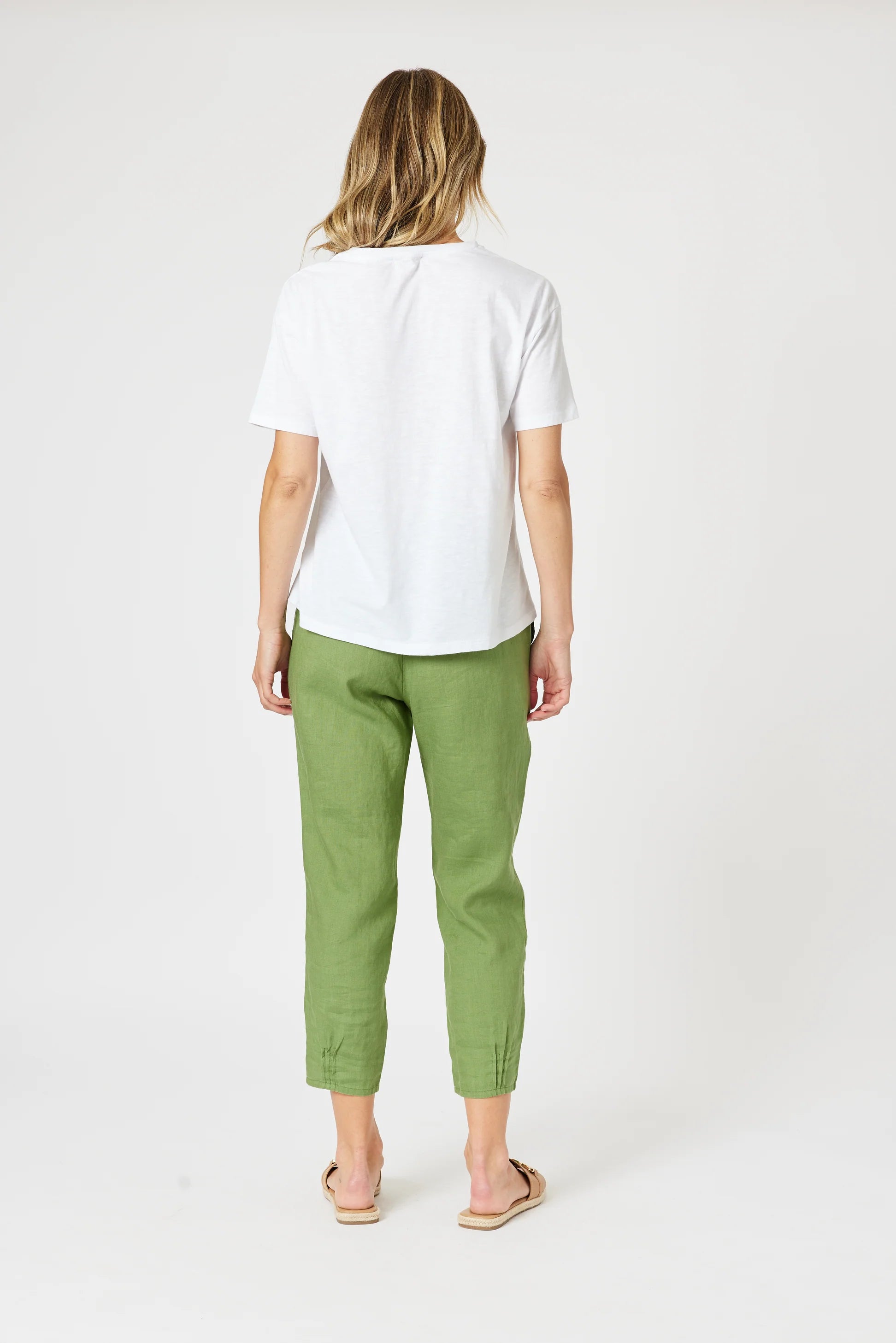 Elevate your everyday style with the Gordon Smith Sarah Linen Pants in Basil. The perfect blend of comfort, elegance, and effortless wearability. Crafted from premium, ultra soft 100% linen, these lightweight pants are designed to move with you through every season. The high rise, pull-on style features a wide encased elastic waistband for a flattering and flexible fit. Clever front stitched pocket bags enhance ease of movement, while the subtle pleat detail at the hem adds a touch of sophistication and a slimming finish. Specially garment-washed for extra softness and reduced creasing, these cropped linen pants are your new must-have for breathable, all-day comfort.